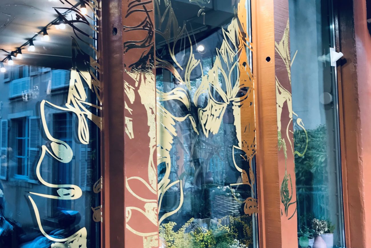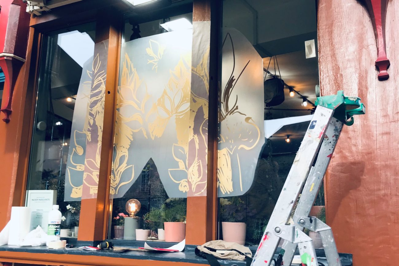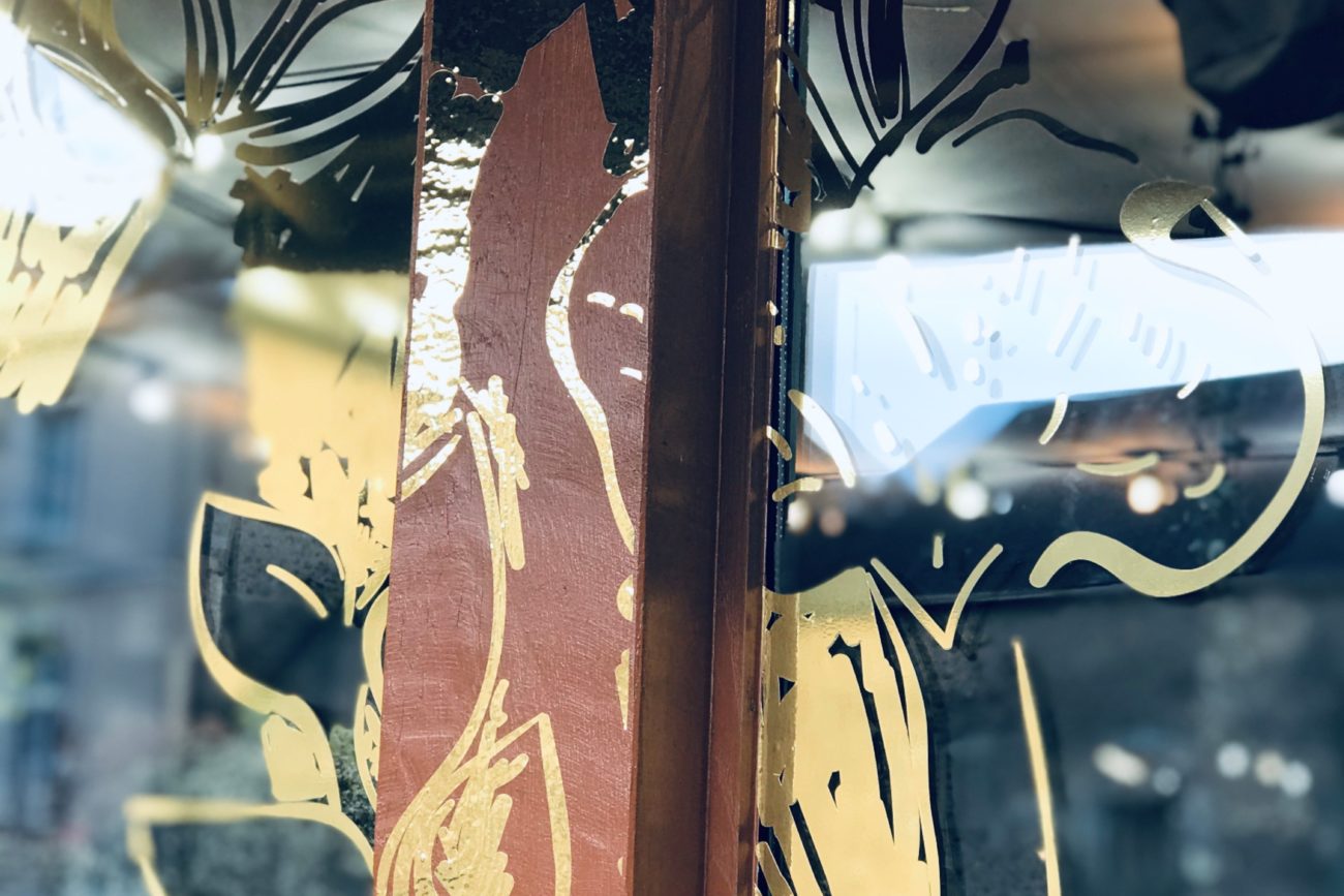 Vitrophanie en adhésif imitation laiton poli miroir sur vitre et montant bois pour MAISON MARGUERITE.