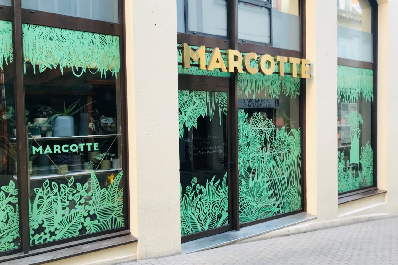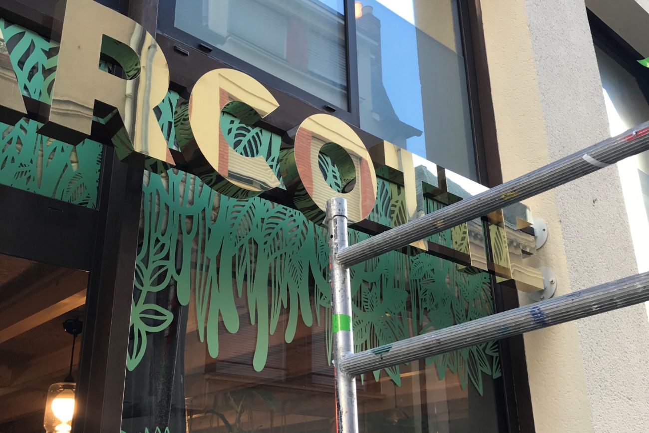 Pose d’une vitrophanie en adhésif imprimé, finition satin.