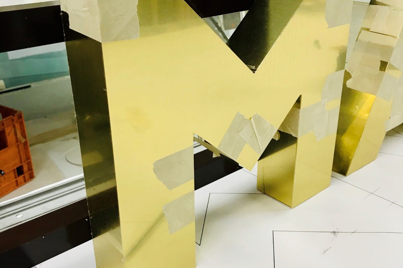 Fabrication sur-mesure d’un lettrage relief en laiton. Installation sur lisses.