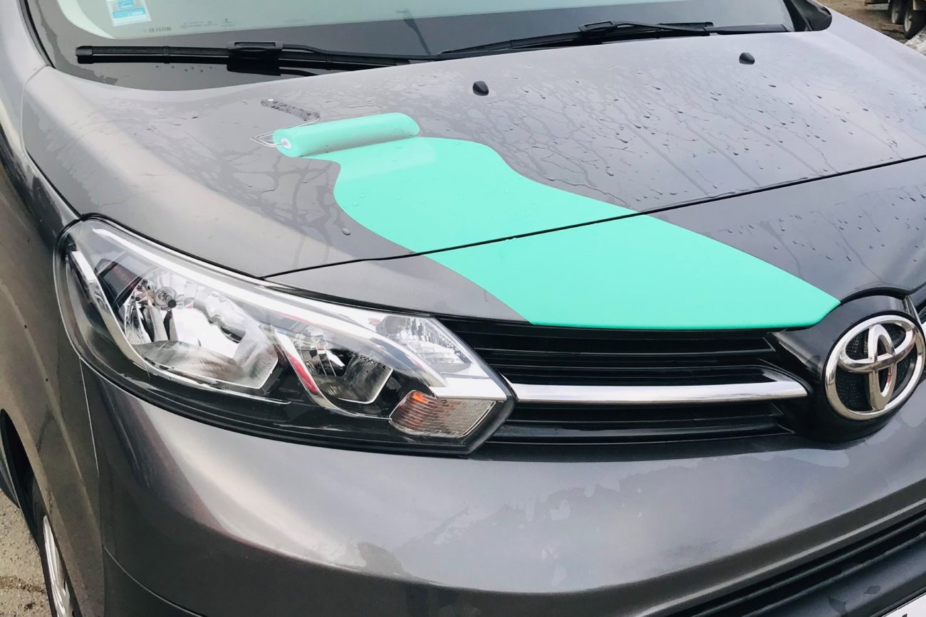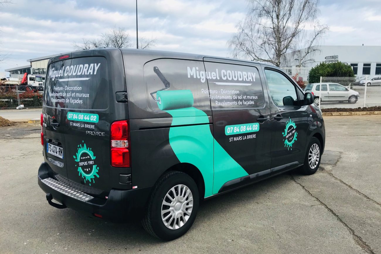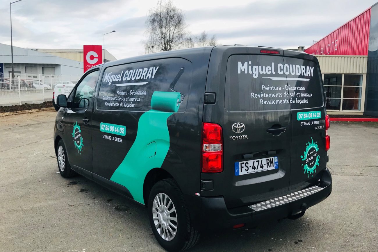 Conception graphique, impression numérique et pose de la décoration du véhicule publicitaire MIGUEL COUDRAY.