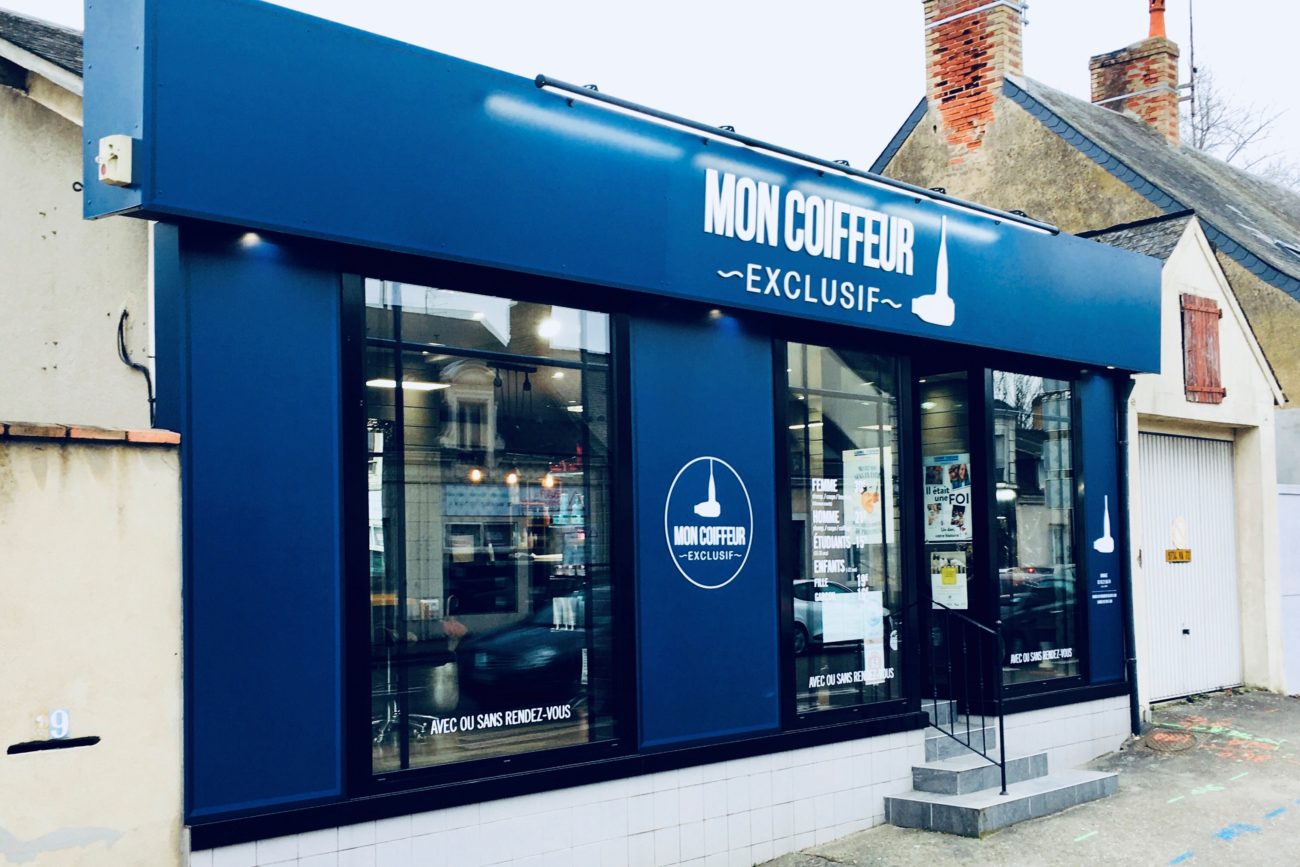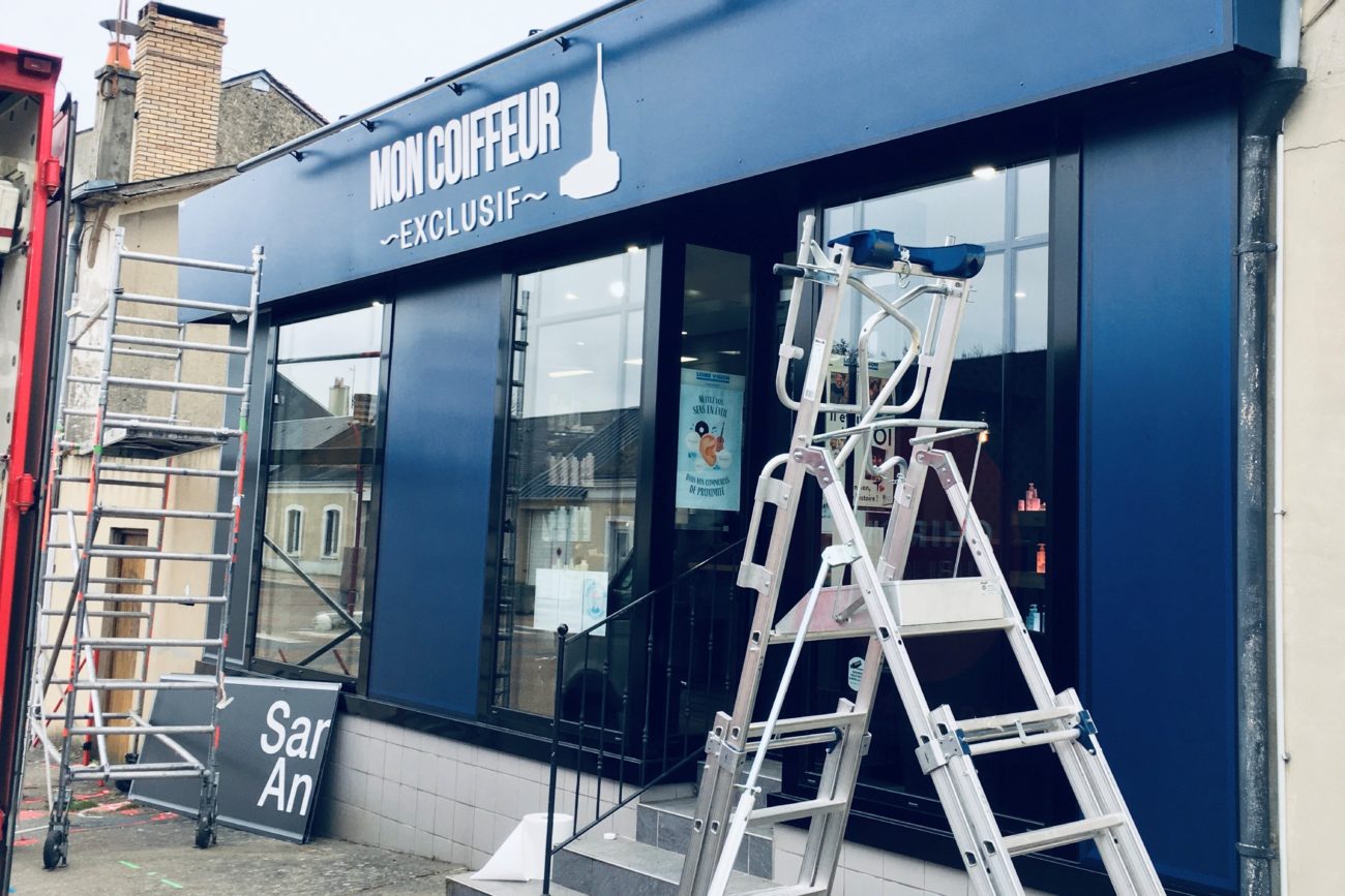 Habillage en panneaux dibond contre collé d’adhésif du bandeaux et des montants verticaux. Logo et lettrage en plexiglass blanc 10mm. Vitrophanie en adhésif blanc découpé.